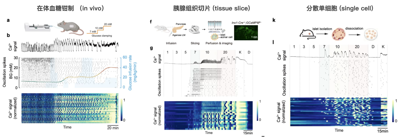 为验证该现象的调控基础,研究团队构建了“在体血糖钳制 - 胰腺组织切片 - 分散单细胞” 的多层级实验模型(图2)。结果显示,血糖依赖的节律转变在保留细胞间旁分泌信号的胰腺组织切片中依然存在,但在失去旁分泌交流的分散β细胞中完全消失。这明确了胰岛内细胞间旁分泌信号是HESF现象的核心调控基础,突破了以往仅关注β细胞自主节律的认知局限。