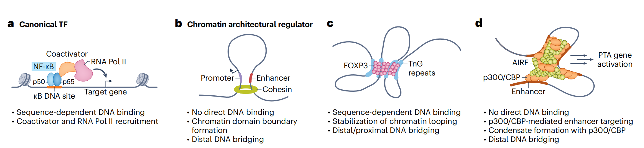 总体而言,无论是FoxP3通过多聚化桥接染色质形成结构网络,还是Aire通过凝聚体构建转录枢纽,这些发现共同指向一种新的转录调控模式:基因表达不仅取决于转录因子“结合在哪里”,更取决于其“如何组装以及如何塑造染色质的三维结构”。这一“结构维度”的新框架,不仅解释了传统模型难以回答的问题,也提示类似机制可能广泛存在于其他转录因子中,为理解复杂生命过程中的基因调控网络提供了新的视角,并为未来靶向转录因子“组装状态”的精准干预策略开辟了新方向。