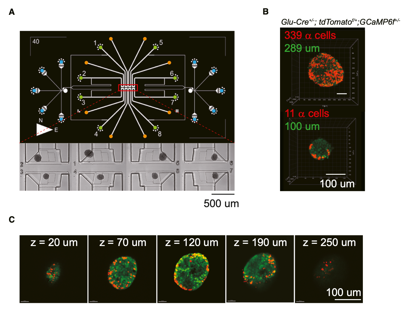 图1:为探索葡萄糖刺激胰岛钙活动与结构关系,研究团队设计了集成微流控芯片,实现8个胰岛同步活动成像,功能成像后通过双光子显微镜成像胰岛结构。