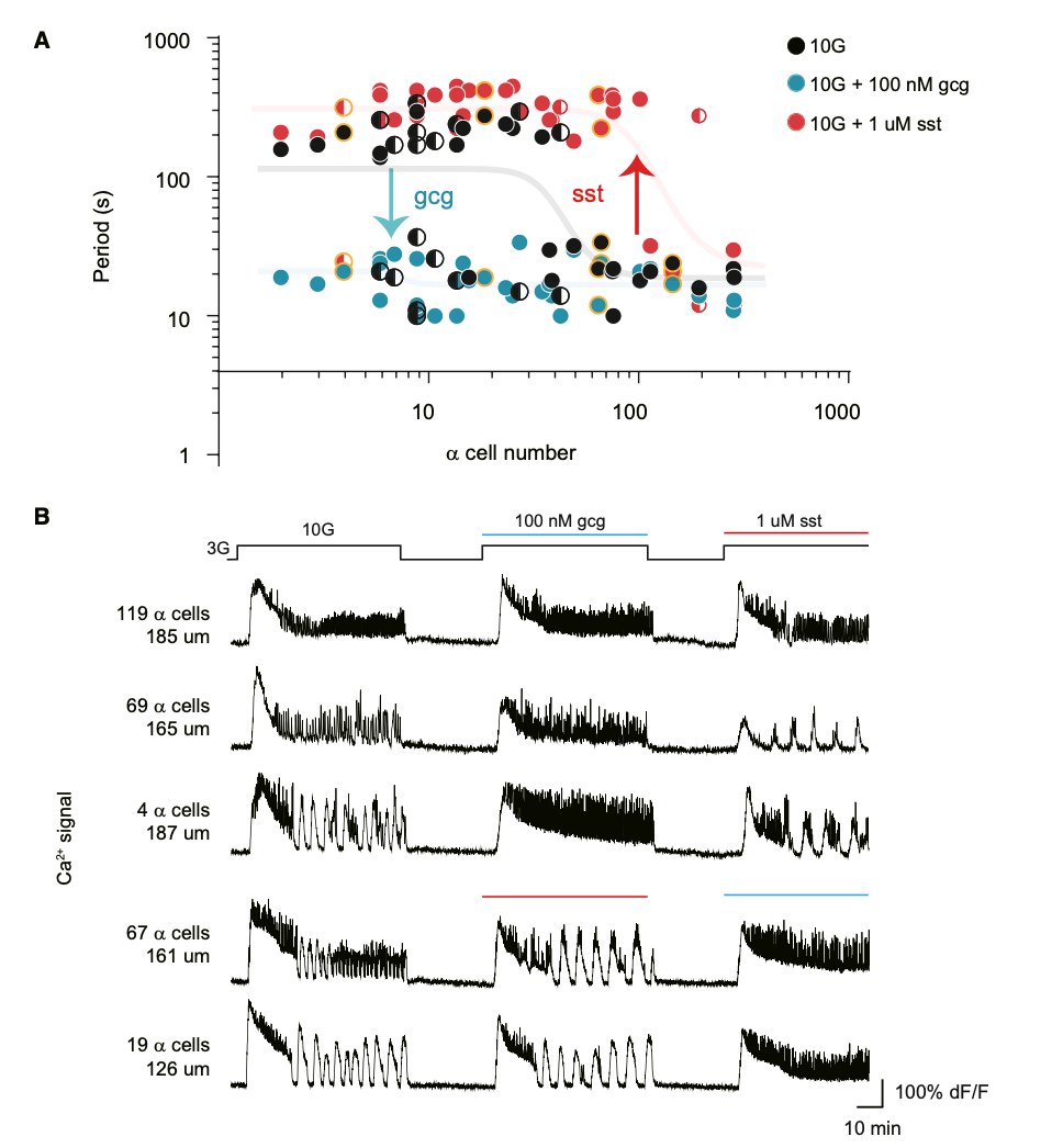 图2:胰岛震荡模式依赖于胰岛α细胞数量,且可被外源胰高血糖素及生长抑素调控。