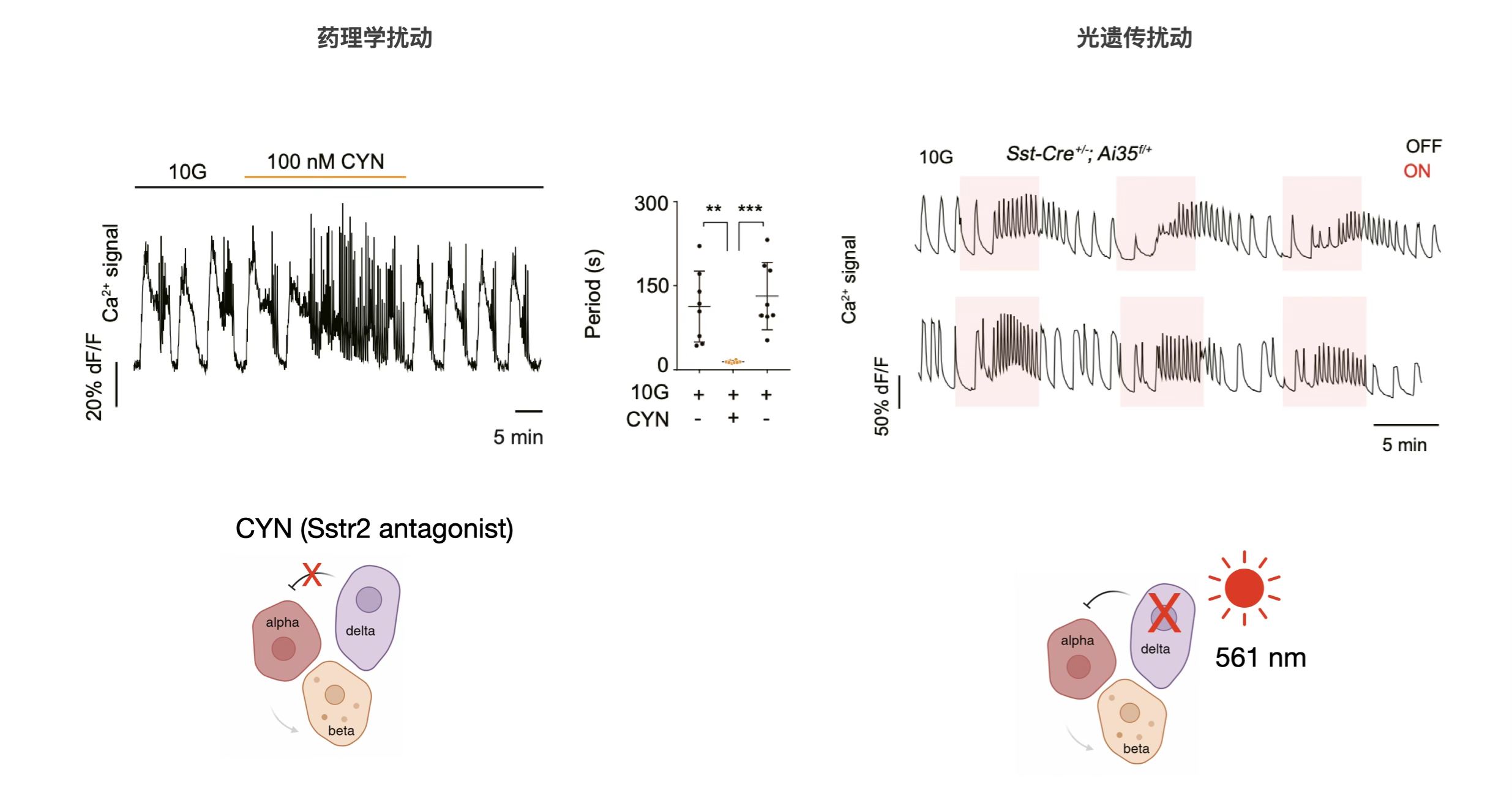 图3:药理学及光遗传扰动δ细胞可逆的转变胰岛震荡模式。