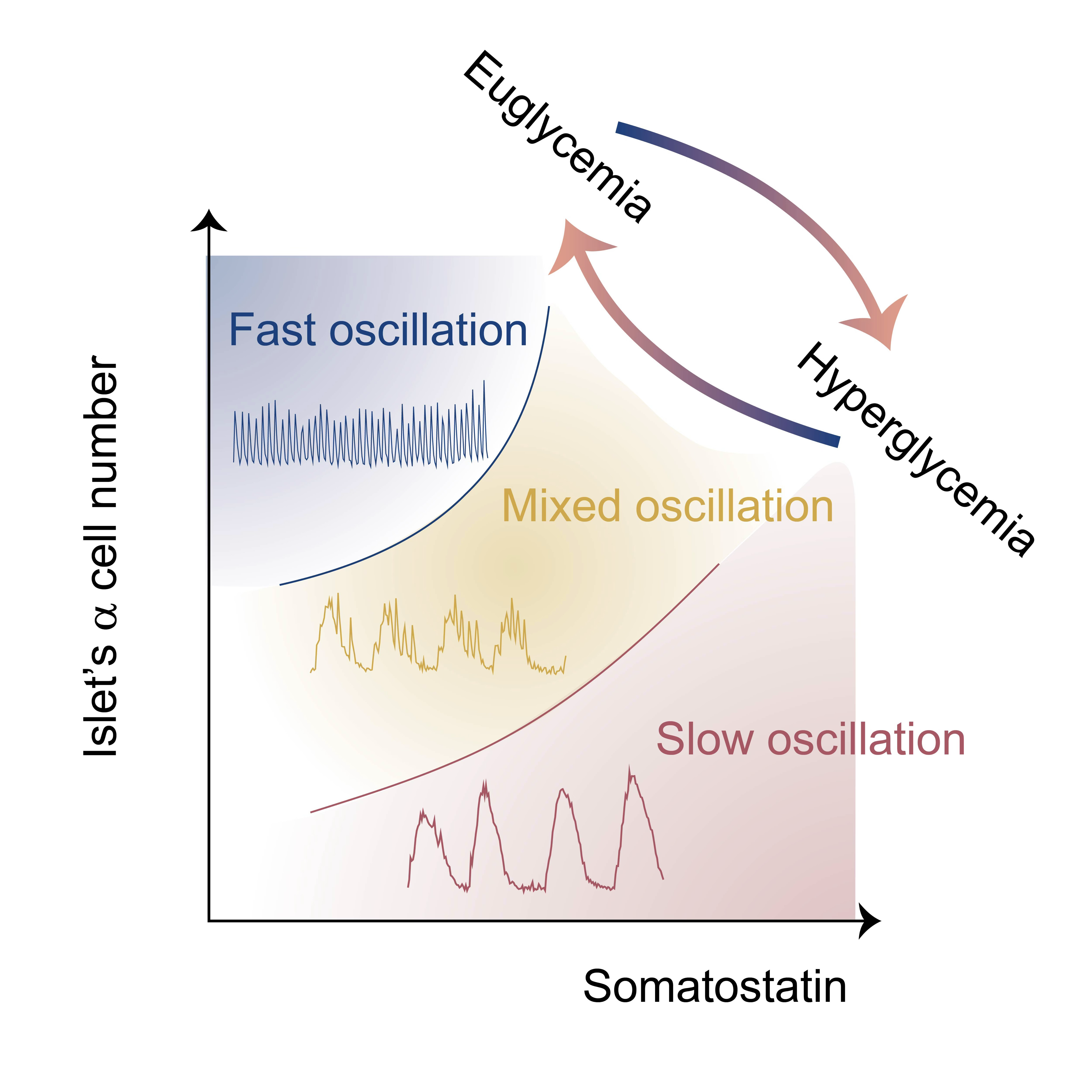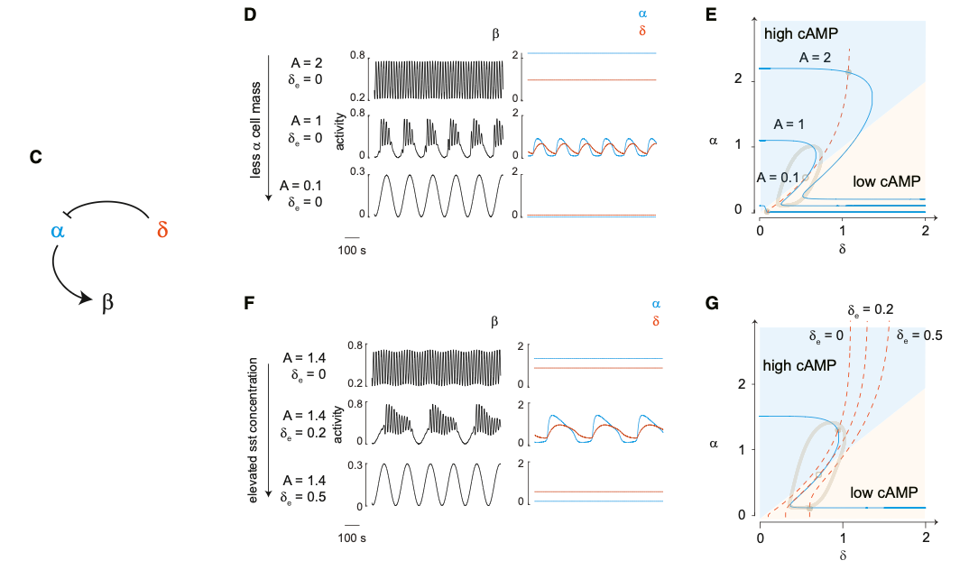 为了定量研究胰岛δ细胞与α细胞如何控制三种钙震荡模式,研究团队在不同α细胞数量的胰岛中连续升高生长抑素浓度(δ细胞分泌)。发现随着生长抑素浓度升高,胰岛依次从快速振荡→混合振荡→慢速振荡(图4)。有趣的是,若将α细胞数量连续排列,也有同样规律:α细胞数量最多的胰岛呈现快速震荡,数量最少的胰岛呈现慢速震荡,数量居中的胰岛呈现混合震荡。以上结果表明:快速、混合、慢速振荡是胰岛的三个连续生理状态,混合振荡为快慢振荡之间的过渡态,而δ细胞与α细胞的旁分泌作用强度,是决定振荡模式的核心参数。