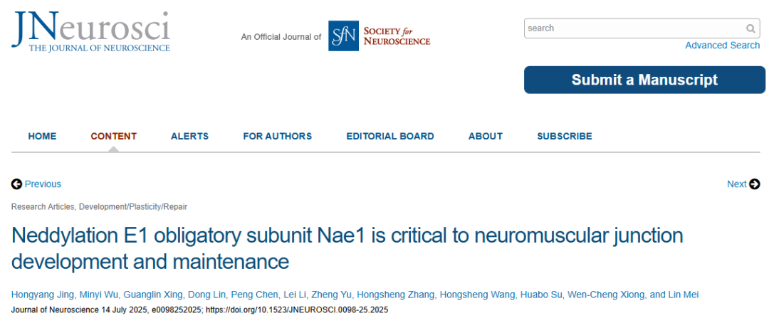Recently, Professor Lin Mei's team from Chinese Institutes for Medical Research (CIMR), Beijing published a cover article titled "Neddylation E1 obligatory subunit Nae1 is critical to neuromuscular junction development and maintenance" in the journal Journal of Neuroscience. The study found that Nae1, an essential subunit of the Neddylation E1 enzyme, is crucial for the development and maintenance of the neuromuscular junction.