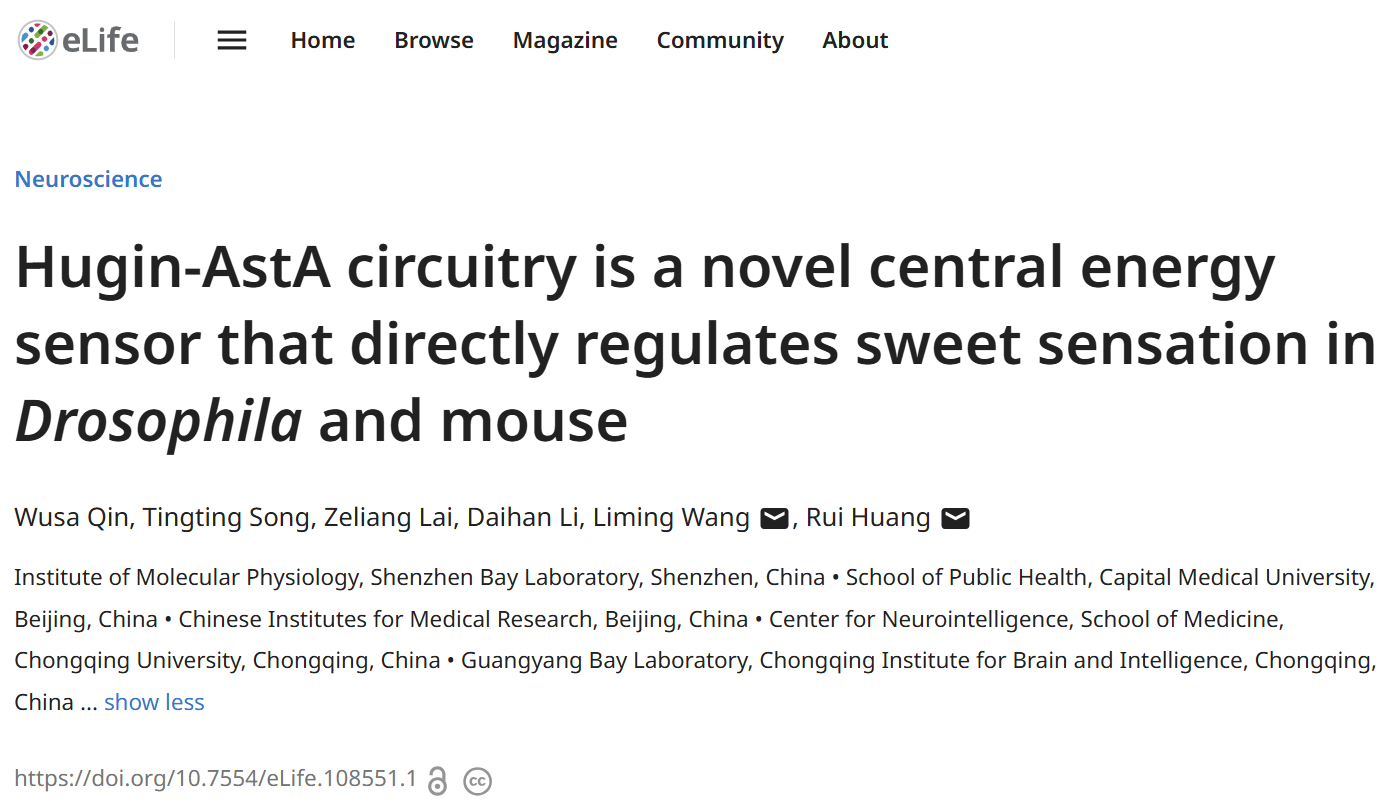 Recently, Professor Liming Wang's team from Chinese Institutes for Medical Research (CIMR), Beijing and Capital Medical University published an article titled "Hugin-AstA circuitry is a novel central energy sensor that directly regulates sweet sensation in Drosophila and mouse" in the journal eLife.
