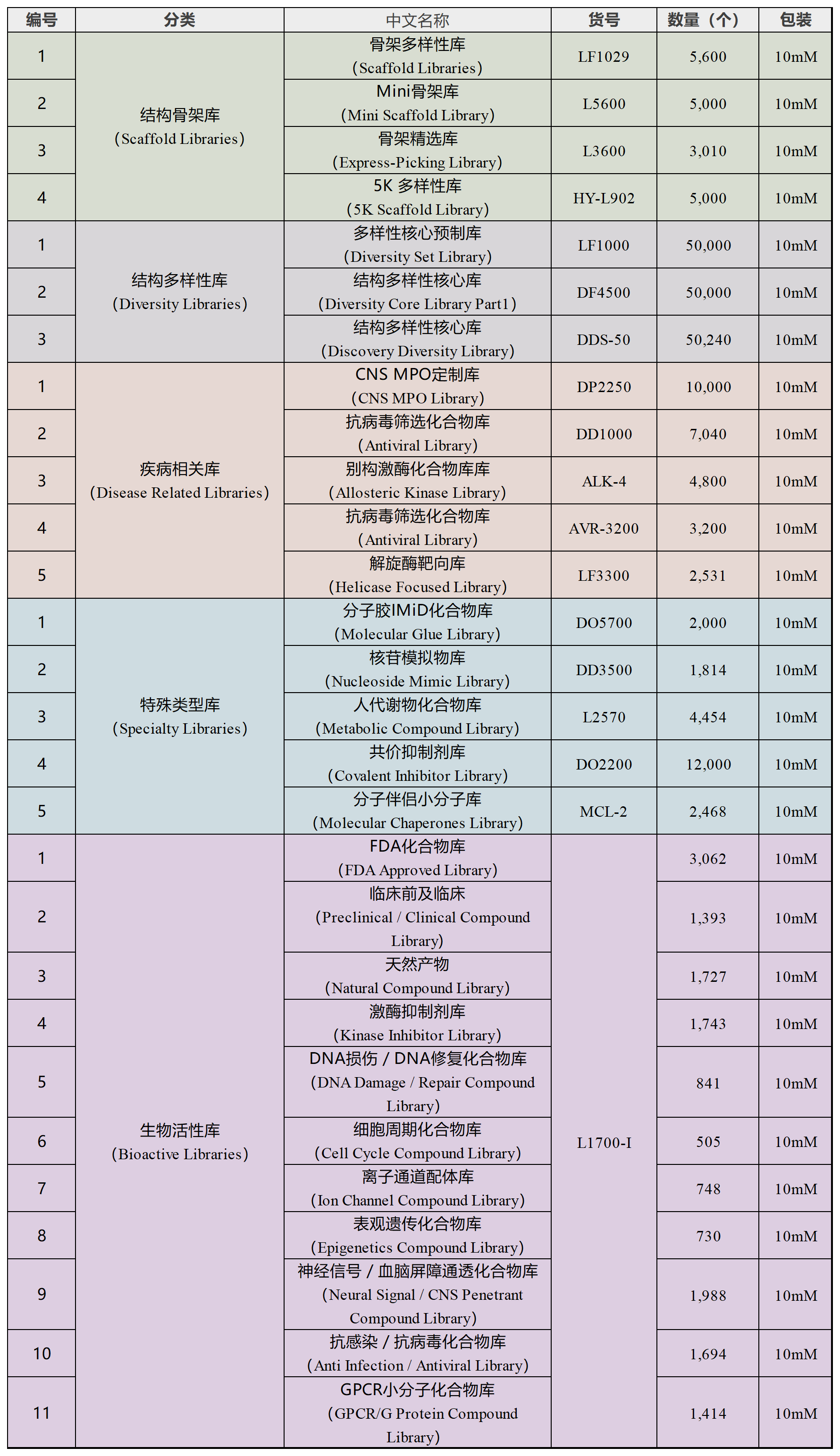 平台内建的小分子化合物库包含22万种来源多样的化合物,可开展苗头化合物的高通量(HTS)或高内涵(HCS)筛选。用户可根据疾病靶点、实验目的等灵活选择合适的化合物库。其中,L1700-I已知活性化合物库支持单个挑取,随取随用。