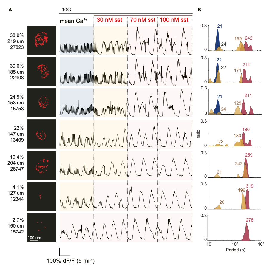 高糖刺激实验表明,胰岛钙振荡模式与α细胞数量呈定量依赖关系(图2):当胰岛内α细胞数量多于40个时,呈现快速振荡;α细胞数量少于40个时,呈现慢速振荡。外源干预实验进一步验证调控:补充胰高血糖素可使所有胰岛转为快速振荡,且不再依赖α细胞数量;补充生长抑素则可诱导振荡模式转为慢速,且振荡仍然依赖α细胞数量, 1μM生长抑素可将快速振荡的α细胞数量阈值从40个提升至100个。该结果明确,胰岛振荡模式受δ细胞(分泌生长抑素)与α细胞(分泌胰高血糖素)的旁分泌信号协同调控。