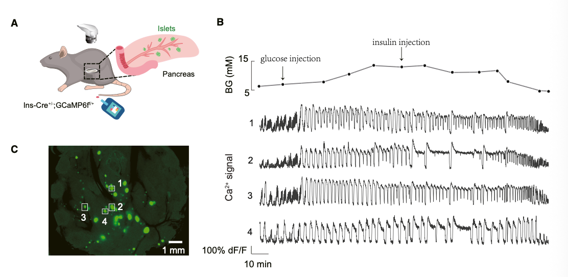 胰岛直径分布于50-200μm之间,为实现不同尺寸胰岛的高通量稳定灌流与同步成像,研究团队自主研发微流控芯片(专利号ZL 2024 1 0739918.1),可同步完成8个胰岛的功能活动成像;同时构建α细胞红色荧光标记、全胰岛钙信号绿色荧光标记的转基因小鼠模型,结合双光子显微镜实现胰岛功能活动与三维结构的精准关联分析。基于该技术体系,研究团队发现:同一胰岛在重复高糖刺激下,钙振荡模式高度稳定可重复,证实胰岛振荡模式是其自身固有的生理属性,为后续机制研究奠定了基础。