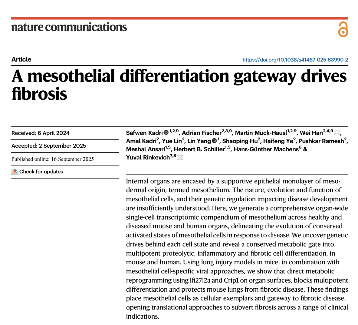 Organ fibrosis is a common terminal pathway in many chronic diseases, such as idiopathic pulmonary fibrosis, cirrhosis, and heart failure, and there is currently a lack of effective treatments. The traditional view holds that fibrosis is primarily driven by fibroblasts within the organ. However, what role do mesothelial cells, which cover the surface of the organs, play in fibrosis—are they mere "bystanders" or "active participants"? If they are participants, how are they activated, how do they change, and how do they drive the disease process? These core questions have not been systematically addressed until now.