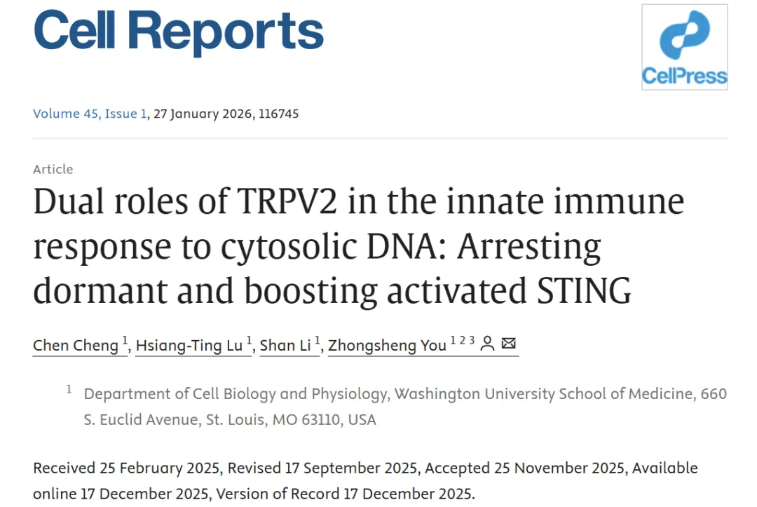 Recently, Professor Zhongsheng You's team from Chinese Institutes for Medical Research (CIMR), Beijing published an article titled "Dual roles of TRPV2 in the innate immune response to cytosolic DNA: Arresting dormant and boosting activated STING" in the journal Cell Reports.