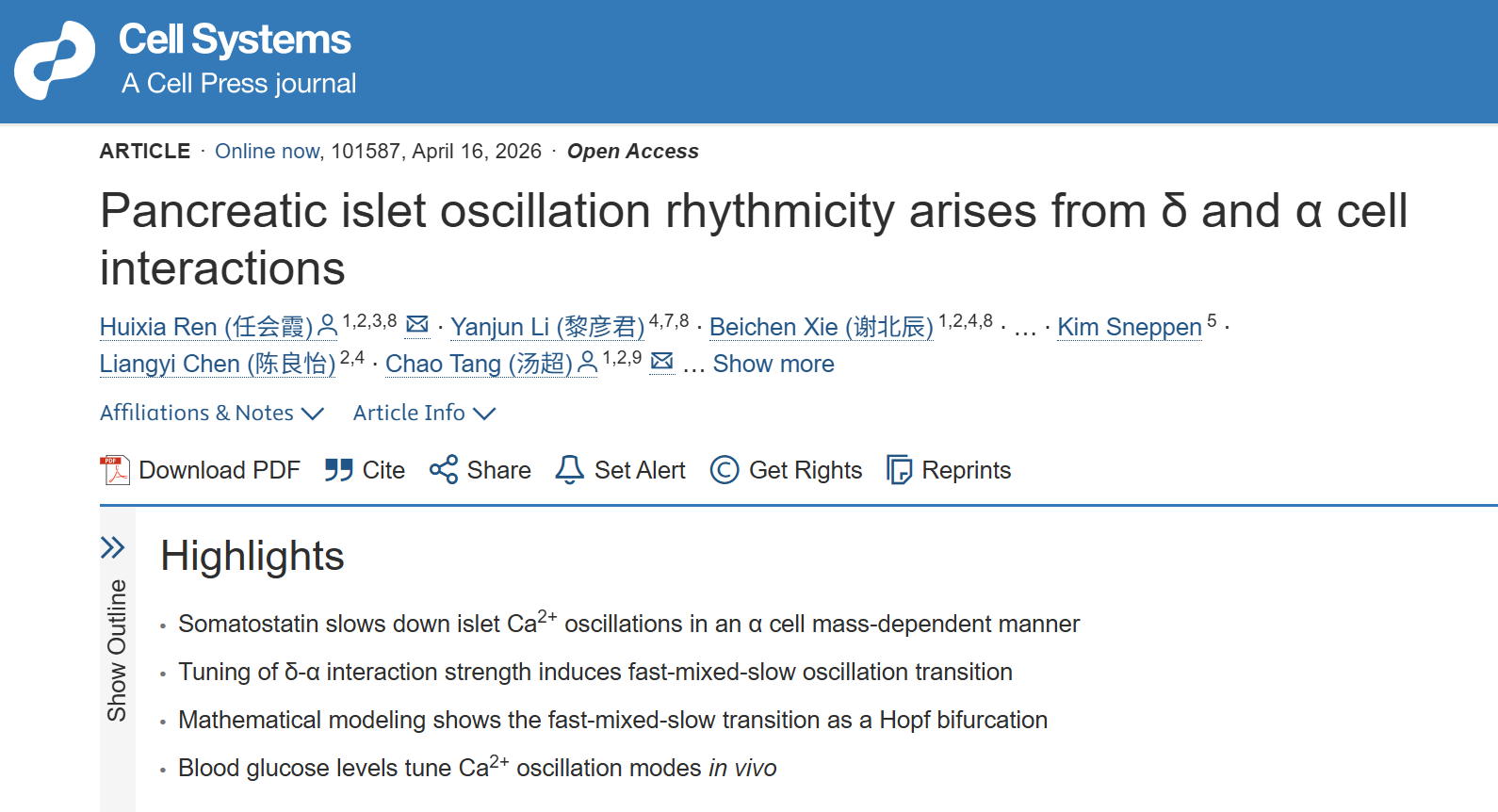 Recently, Huixia Ren's team from Chinese Institutes for Medical Research (CIMR), Beijing published an article titled "Pancreatic islet oscillation rhythmicity arises from δ and α cell interactions" in the journal Cell Systems.