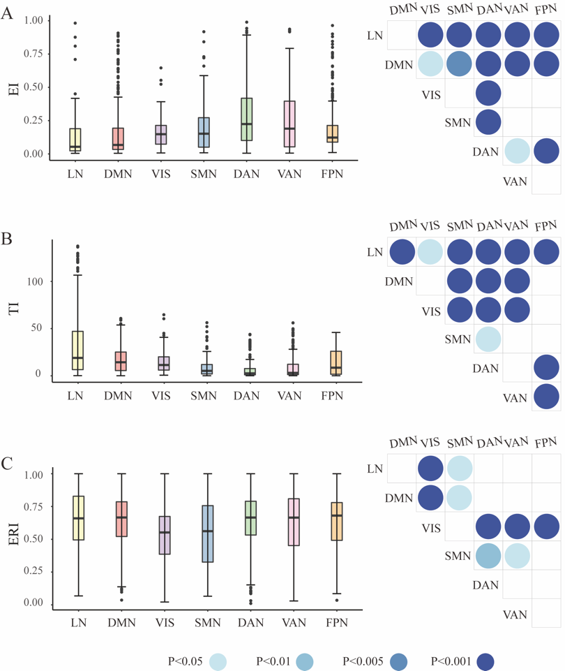 图2:A. 每个IN内和整个网络中的网络内和网络间的EI值;B. 每个IN内和整个网络中的网络内和网络间的T值;C. 每个IN内和整个网络中的网络内和网络间的ERI值